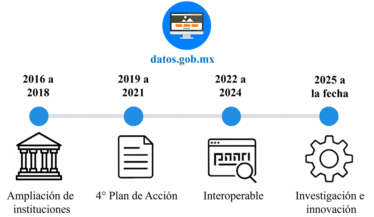 La evolución del portal nacional ha tenido hitos importantes a lo largo del tiempo, por ejemplo (véase Figura 1), en el periodo de 2016 a 2018 se anexaron las categorías de economía, salud, educación y medio ambiente. En el periodo de 2019 a 2021se integraron más de 4,000 bases de datos de diferentes dependencias. La interoperabilidad con otros sistemas como Ajolote y Data México se realizó entre el 2022 y 2024, mejorando así sus capacidades de infraestructura.