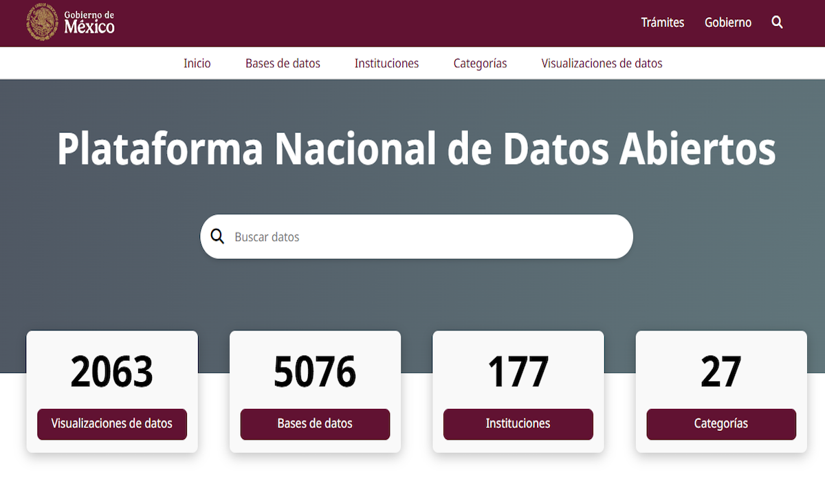 México cuenta con una plataforma nacional de datos abiertos, accesible desde la URL datos.gob.mx y a la fecha, reporta poco más de 5,000 bases de datos. Desde su primer lanzamiento oficial en el año 2015, el portal web surgió como parte de la Estrategia Digital Nacional y concentró bases de datos gubernamentales en formatos abiertos, como CSV (Valores separados por comas), JSON (Notación de objetos JavaScript) y XML (Lenguaje de marcado extensible).