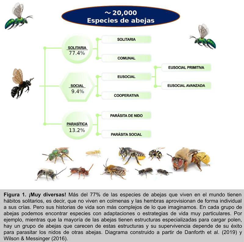 - Contrario a como solemos verlas representadas en general en la cultura popular, ni todas las abejas viven en colmenas ni todas lucen iguales entre sí. Las abejas presentan una amplia variedad de tamaños y formas, tan diversas y asombrosas como lo son también las flores, su principal fuente de alimento (polen y néctar) y refugio.