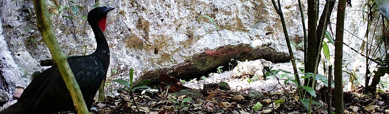 Fig 3. Registro fotográfico en cámara-trampa de pava cojolita (Penelope purpurascens) en zona de selva mediana en UMA de vida libre del Estado de Veracruz. Foto: Carolina Álvarez y Elí Alejandra Saucedo.