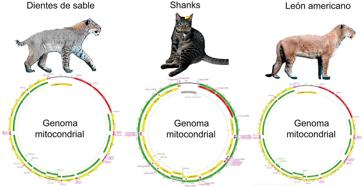 Las mitocondrias son orgánulos dentro de células eucariotas que poseen su propio ADN, el cual se hereda de un solo progenitor. Los genes de la mitocondria, tanto de dientes de sable, león americano y gato doméstico (el buen amigo Shanks), consisten en ADN circular, el cual puede variar en tamaño y estructura con respecto a otros organismos (Figura 1). El ADN mitocondrial parece haber evolucionado de un ancestro eubacteriano, y la teoría endosimbiótica propone que las mitocondrias comenzaron como eubacterias de vida libre que lograron desarrollar relaciones endosimbióticas con las primeras células eucariotas; un fenómeno complejo de entender, pero interesante para los biólogos. Aquí te contamos del uso que le dan los científicos al ADN mitocondrial para entender una pequeña parte de la historia de los félidos extintos y vivos.