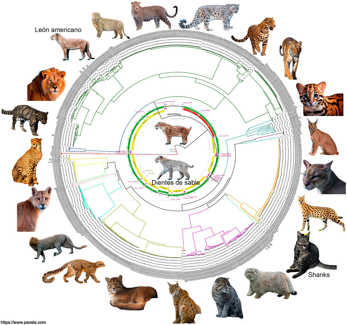 Los félidos o felinos son una familia de mamíferos del orden Carnivora. Entre sus representantes se encuentran los extintos dientes de sable y el león americano, así como el tigre, león, jaguar, leopardo y puma, entre sus cinco representantes vivos más grandes dentro de la familia, y se encuentran entre los mamíferos cazadores más sigilosos (Figura 2). Los extintos dientes de sable son reconocidos como representantes de la megafauna del Pleistoceno y forman un grupo distinto de todos los felinos vivos. Las especies de los géneros Homotherium y Smilodon eran depredadores que vivieron tanto en el viejo como en el nuevo mundo, principalmente en Eurasia y América del Norte. En América del Norte, estos depredadores vivieron hasta el Pleistoceno tardío y se extinguieron junto con otras especies como mamuts y perezosos gigantes. Gracias al ADN mitocondrial y técnicas de ADN antiguo, ahora se conoce la historia evolutiva de los dientes de sable, el león americano y su relación con otros felinos vivos. En la actualidad, se tienen varios cientos de genomas mitocondriales de felinos vivos, disponibles en bases de datos, lo que permite a los científicos estimar la ubicación de los dientes de sable dentro de todos los felinos. Por lo tanto, se sabe que los dientes de sable y sus primos felinos vivos se separaron hace aproximadamente 20 millones de años.