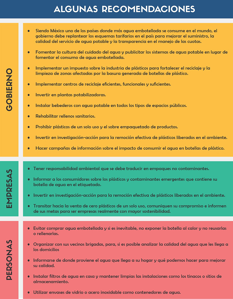 ¿Cuál es nuestra responsabilidad en esta problemática? En México, aunque nuestra Constitución obliga a los municipios proporcionar agua potable, en el año 2020 se estimó que cada mexicano consume en promedio 286 litros de agua embotellada al año resultado en ingresos millonarios para las empresas involucradas. Una botella de agua de medio litro pueden llegar a costar su equivalente en gasolina. Con concesiones de agua sumamente baratas, estas empresas convierten un bien público en un producto privado y experimentan ganancias de hasta 5000%. Esto además genera un daño ambiental resultando en aproximadamente 21 millones de botellas de plástico desechadas diariamente. La problemática del agua potable en México lleva décadas desarrollándose con fallas en la administración pública aunado a las campañas de agua embotellada señalando su supuesta pureza contra el agua del grifo. Sin embargo, nunca es demasiado tarde revertir estas tendencias, exigiendo a los tomadores de decisiones mejoras en el servicio del agua potable, asegurando que el agua en nuestros tinacos se almacena limpia, invirtiendo en sistemas de filtraje y botellas de agua reutilizables y demandando que las empresas del sector de agua embotellada se hagan responsables por el reciclaje de las botellas de plástico. ¡Todos podemos hacer algo! Mira nuestras recomendaciones