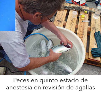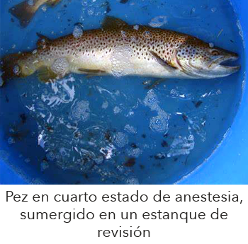 La observación y procedimiento que se realiza con un anestésico debe ser rápida, el pez debe estar húmedo o sumergido en poca agua (para mantener las agallas húmedas), y en caso de mantenerse en pecera, se debe mantener oxigenación y temperatura constantes (Fig. 3). La recuperación se da colocando al pez de regreso a una pecera que tenga agua de su estanque con aireación. El pez se recuperará en cuestión de minutos.