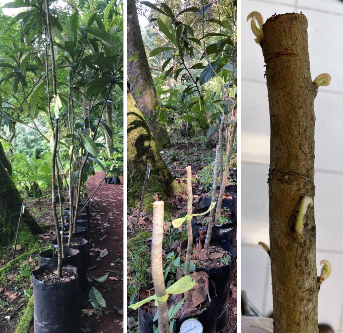 Para conocer más sobre el potencial invasor del níspero, Eriobotrya japonica, lo estudiamos por algunos años. Encontramos que, además de tener un porcentaje de germinación muy alto en diferentes condiciones de luz, aunque prefiere más germinar en sombra, y tener un crecimiento relativamente lento, es un árbol que rebrota abundantemente. El potencial de rebrote de níspero se determinó experimentalmente, cortando árboles adultos de diferentes tamaños en un bosque secundario y plántulas en el borde del bosque. Esto con el fin de evaluar el número de rebrotes, las dimensiones, la posición de emergencia de los rebrotes, la supervivencia y el número de hojas por rebrote.
