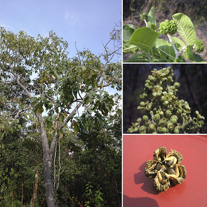 Esenbeckia vazquezii, especie en peligro crítico del estado de Morelos; a la izquierda el árbol completo, a la derecha las estructuras reproductivas (Autor: Esteban Manuel Martínez Salas)