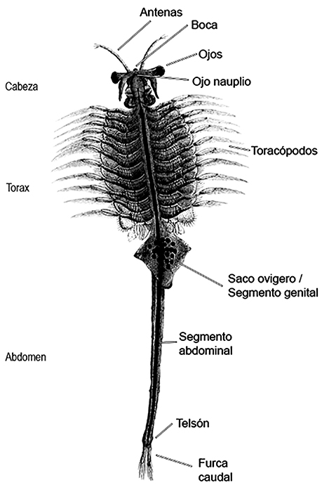 La Artemia salina es un pequeño crustáceo que habita en lagos y lagunas salobres, posee un cuerpo delgado y alargado con un exoesqueleto blando. En promedio su longitud esta entre los 7 y 12 milímetros, pudiendo llegar hasta los 18 milímetros en su etapa adulta; presenta tres secciones bien diferenciadas: cabeza, tórax y abdomen. Presenta dos pares de antenas y respiración branquial. Su expectativa de vida por individuo puede ser de hasta un año. Su existencia como especie data de más de 100 millones de años.