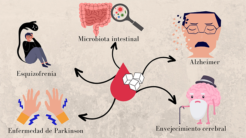 El aumento de glucosa en sangre puede desencadenar o acelerar el desarrollo de enfermedades del Sistema Nervioso Central y alterar la microbiota intestinal. Ana Carolina Mota López, Canva