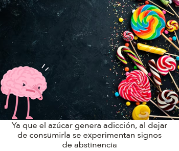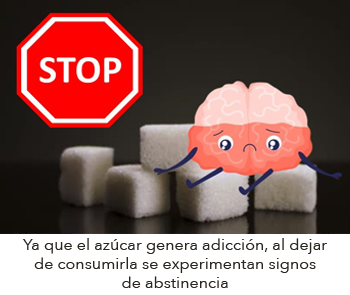 Lo peor de todo, es que el rico sabor del azúcar genera adicción, desencadenando conductas como el deseo excesivo de consumo y la tolerancia, por eso cuando se quiere disminuir o dejar de consumir azúcar se experimentan signos de abstinencia como ansiedad y agresión; similares a los que se sienten al tratar de dejar cualquier otra droga (Figura 3).