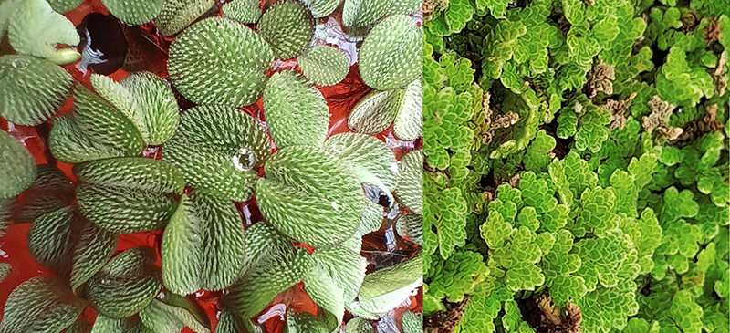 Salvinia minima (izquierda) y Azolla sp. (derecha) (Créditos: Alejandro Hernández y Francisco J. Melo)