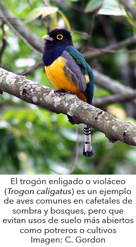 Estudios realizados en el centro del estado de Veracruz, y apoyado por estudios en otras regiones cafetaleras (Moguel y Toledo, 1999; Jha et al. 2014), documentaron que los cafetales con un manejo arbolado, incluyendo un dosel con árboles de mayor talla que forman una mayor estratificación, y que incluyen más especies de árboles por hectárea, les permiten albergar una gran parte (hasta 85%) de la diversidad de los fragmentos de bosque de niebla de la misma zona (Manson et al. 2008). Otros aportes de la sombra diversificada en la conservación de la biodiversidad incluyen su capacidad de reducir los “efectos de borde” que provocan cambios bruscos en la temperatura, humedad, y viento hacia el interior de los fragmentos de bosque; así como su capacidad de formar corredores biológicos que facilitan el movimiento de especies especialistas de hábitats boscosos (Figura 1) entre fragmentos de bosque en la misma zona (Manson et al. 2008; Jha et al. 2014; Schroth y McNeely 2011).