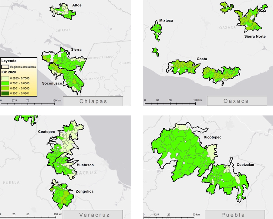 Como parte del estudio de TEEB AgriFood liderado por el Instituto de Ecología, A.C. (INECOL) y realizado en 287 paisajes cafetaleros ubicados en 11 regiones cafetaleras en los estados de Chiapas, Veracruz, Oaxaca y Puebla, se evaluaron los impactos de cambios de uso de suelo durante el periodo 1995-2020 en la capacidad de los paisajes cafetaleros para albergar la biodiversidad. Debido a la gran superficie estudiada (unas 320 mil ha) era imposible medir la biodiversidad directamente, por lo que los investigadores desarrollaron un Índice de Biodiversidad Paisajística (IBP) con valores entre 0 y 1 (menos a más capacidad de albergar la biodiversidad). El IBP consideró el nivel de intensificación del uso de suelo en cada paisaje cafetalero asignando valores más altos a usos de suelo más parecidos al bosque y medido a dos escalas – justo alrededor de los conjuntos de los cafetales y considerando el paisaje cafetalero completo. Asimismo, el IBP incluyó métricas, tomadas sobre imágenes satelitales, respecto al grado de agrupación, tamaño y forma de los fragmentos de bosque en cada paisaje, ya que son factores que pueden afectar la diversidad de especies que viven en ellos.