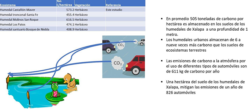 Se encontró un promedio de 505 toneladas de carbono por hectárea almacenado en los suelos a una profundidad de 1 metro. Nuestra vida diaria agrega diariamente gran cantidad de dióxido de carbono a la atmósfera. Por ejemplo, en promedio, las emisiones de carbono a la atmósfera por el uso de diferentes tipos de automóviles son de 611 kg de carbono por año. Tomando en cuenta el almacén de carbono encontrado, resulta que una hectárea del suelo de los humedales de Xalapa, capturan las emisiones de un año de 826 automóviles, mitigando el calentamiento global (Figura 2). ¡Qué bueno que en Xalapa contamos con los humedales para compensar por nuestras actividades en autos!