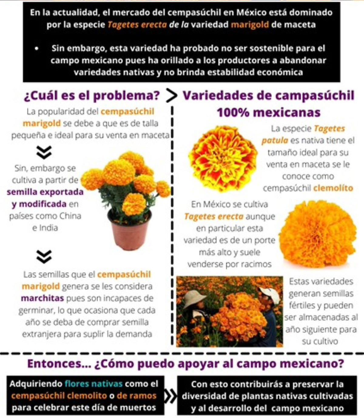 La producción de cempasúchil en México se ha reducido a la producción de flores ornamentales para el Día de Muertos, nosotros no logramos obtener datos sobre la importación de flor viva. Sí encontramos datos en torno a que México importa derivados de cempasúchil de China para uso industrial sobre todo para la industria avícola. Quizás sirva esta experiencia para hacer conciencia sobre la importancia de nuestra biodiversidad y estar más atentos científica, tecnológica y empresarialmente. Mientras tanto, el hermoso cempasúchil debe seguirse cultivando en México y habremos de abrazarlo con cariño en nuestras celebraciones tradicionales. Su cultivo constituye una opción viable por ejemplo para lugares con poca disponibilidad de agua, su requerimiento hídrico es menor que otros cultivos y posee otras características que lo hacen una gran alternativa para diversificar cultivos. No está por demás estar informador y confirmar las noticias que se esparcen.