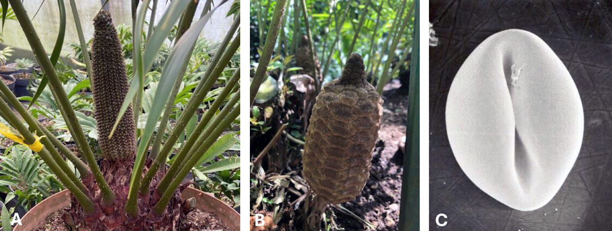 Estructuras reproductivas de cícadas: A) Cono masculino, B) Cono femenino, C) Fotografía al microscopio electrónico de un grano de polen