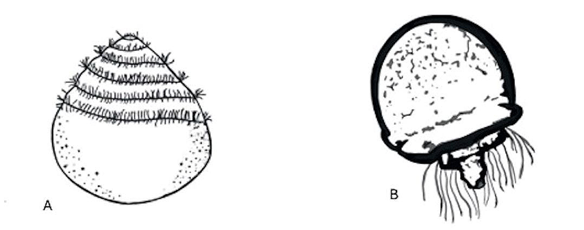 Espermatozoides móviles de A) Cícada y B) Gingko. Ilustración adaptada de las citas 2 y 4