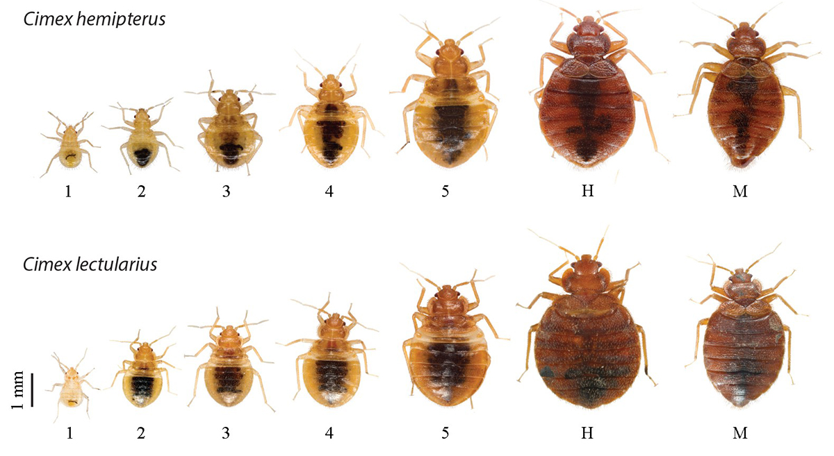 Estados de desarrollo de las dos especies de chinche de cama: estadios ninfales 1–5 (inmaduros) y adultos hembras (H) y machos (M). Imagen modificada de Doggett & Lee (2023)