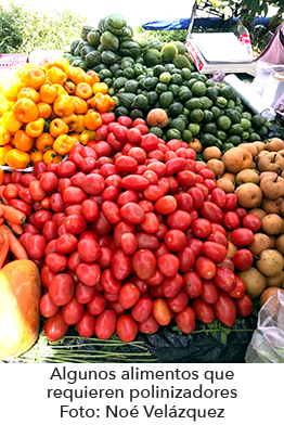 Polinización. A nivel nacional, se cultivan aproximadamente 316 especies de plantas de las cuales se consumen los frutos y semillas de 171, de éstas el 85% dependen de los polinizadores. En términos económicos, el valor de las plantas que dependen de polinizadores a nivel nacional asciende a 43 mil millones de pesos al año. Algunos ejemplos de cultivos que dependen de polinizadores son: chile, jitomate, calabaza, pepinos, cítricos, aguacate, cacao, mango y café entre otros. Desafortunadamente, las poblaciones de polinizadores (principalmente insectos) están disminuyendo drásticamente debido al uso indiscriminado de pesticidas, por desplazamiento de especie introducidas, así como la desaparición o transformación de sus hábitats.