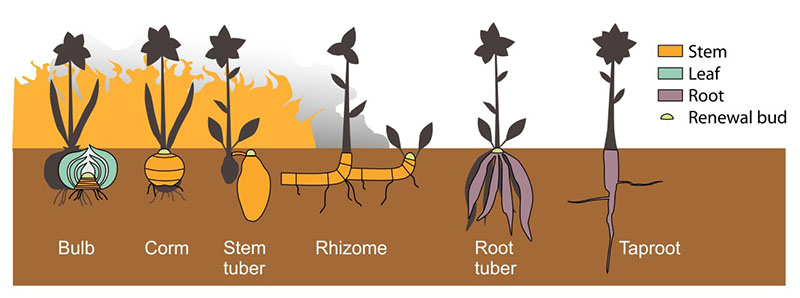 Para sobrevivir fuegos frecuentes, así como el pastoreo por mastodontes, mamuts, y más recientemente ganado, muchas especies de plantas han desarrollado órganos subterráneos especializados (USOs, por sus siglas en inglés) que contienen la energía necesaria para que puedan rebrotar. Los USOs son estructuras derivadas de tallos o raíces que almacenan agua y carbohidratos y es frecuente encontrarlos en pastos, plantas herbáceas, arbustos y árboles. Recientemente, se ha propuesto que la presencia de plantas con USOs grandes es un indicador de sabanas en buen estado de conservación (Veldman et al. 2015).