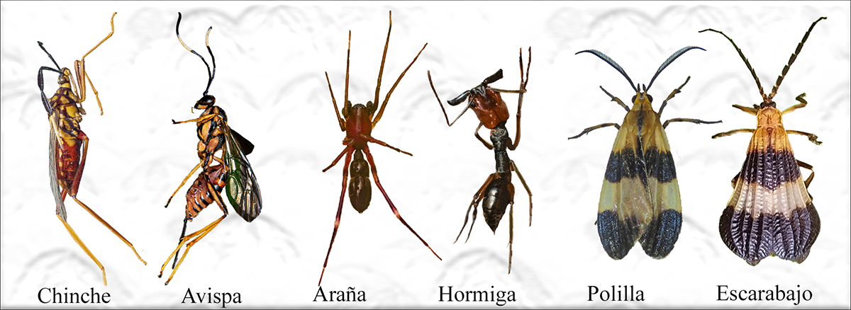 Algunos ejemplos de mimetismo en artrópodos, los miméticos están a la izquierda y sus modelos a la derecha