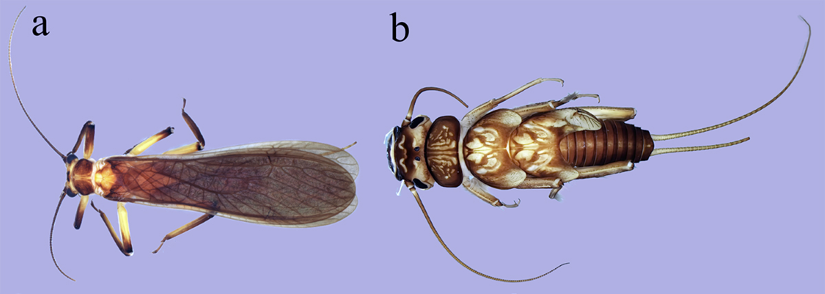 a) Adulto de la familia Perlidae en vista dorsal; b) Ninfa del género Anacroneuria (Perlidae) en vista dorsal