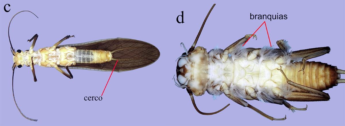 c) Adulto en vista ventral mostrando los cercos; d) Ninfa en vista ventral mostrando los penachos de branquias en las bases de las patas (Fotos Rodolfo Novelo Gutiérrez)