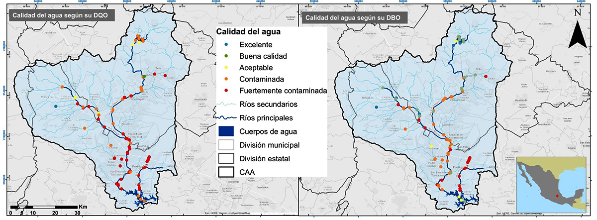 ![]() Distribución de la calidad del agua en la CAA según los indicadores de DQO y DBO. La mayoría de los puntos de muestreo presentan niveles de contaminación preocupantes, especialmente en la parte sur de la cuenca, donde predominan las categorías de agua contaminada y fuertemente contaminada. (Fuente: Elaboración propia con datos de CONAGUA, 2019)