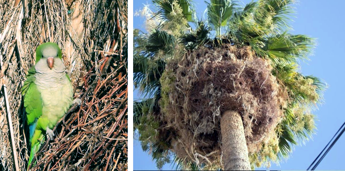 Fig 1. Cotorra monje (Myipositta monachus) en Torreón, Coahuila [foto: Jorge Lozano; iNaturalist México] y nidos interconectados [foto: Claudia Muñoz]
