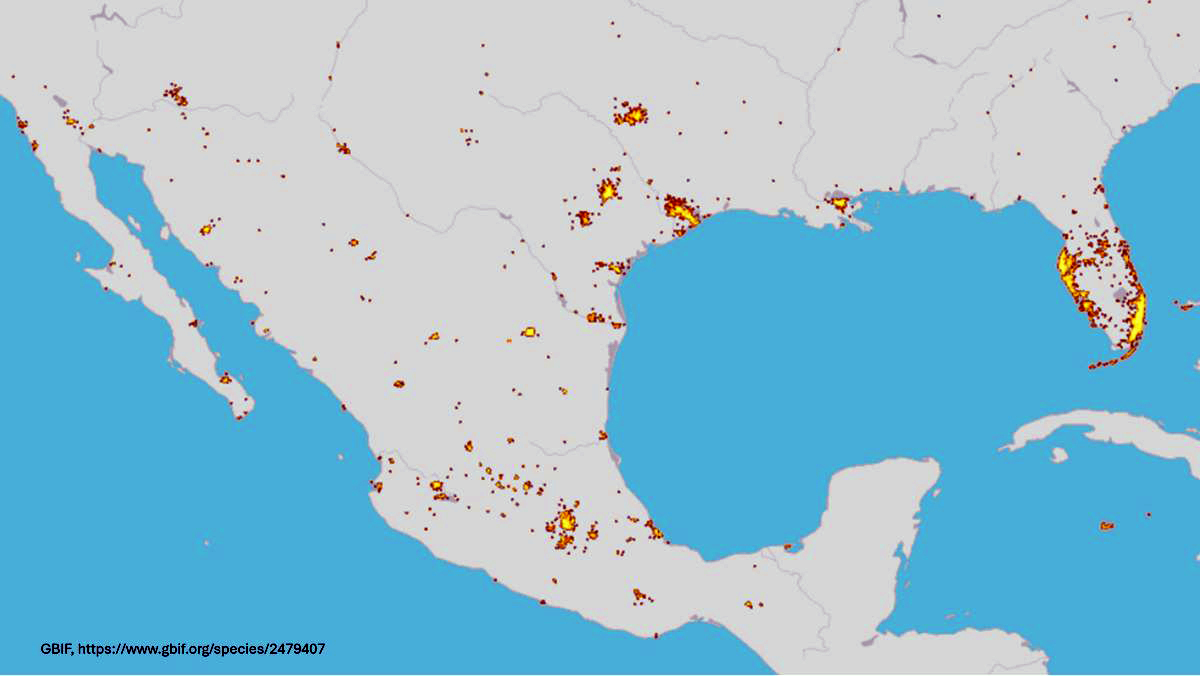 Fig 2. Reportes de avistamientos y colonias establecidas en México [imagen: https://www.gbif.org/species/2479407]