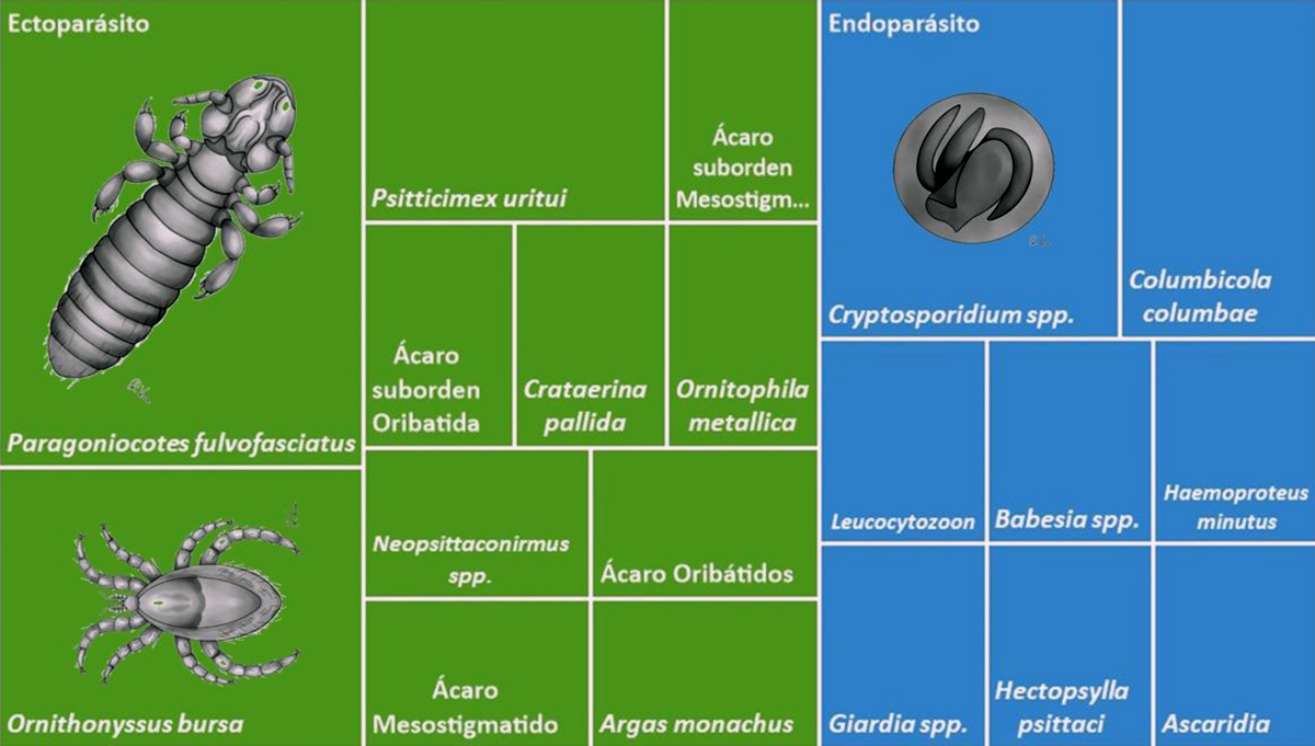 Por otra parte, al igual que muchas especies invasoras, la cotorra monje puede actuar como vector potencial y/o reservorio en la transmisión de enfermedades, introduciendo nuevos patógenos o facilitando la dispersión de patógenos nativos que ponen en peligro a las especies autóctonas y aumentan el riesgo de zoonosis (tránsito de una enfermedad infecciosa de un animal a humanos). En el Hospital Veterinario de Especialidades en Fauna Silvestre de la Facultad de Medicina Veterinaria y Zootecnia de la UNAM, entre 2009 y 2019, la cotorra monje fue llevada a consulta con una frecuencia del 6.56%, siendo la tercera especie de psitácido en ser atendida. En general, en esta especie se han reportado enfermedades infecciosas tanto virales como bacterianas, sin embargo, la presencia de parasitosis ha sido escasa. A través de una búsqueda exhaustiva de literatura científica de publicaciones realizadas entre 2000 y 2021, únicamente se encontramos 13 documentos (11 artículos científicos y dos de literatura gris) sobre la presencia de parásitos externos (o ectoparásitos) e internos (o endoparásitos) de interés veterinario y de salud pública para la cotorra monje. En estas referencias se reportan 17 especies de parásitos (11 externos y 6 internos), teniendo mayor prevalencia los ectoparásitos (27%) que los endoparásitos (16%). Los parásitos mayormente mencionados fueron Paragoniocotes fulvofasciatum, Ornithonyssus bursa y Cryptosporidium spp.