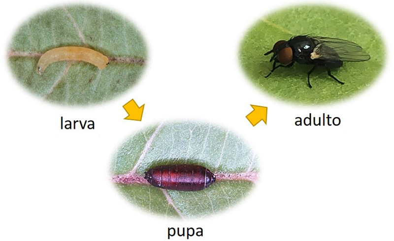 Bien sabemos que muchos dípteros, al que pertenecen las moscas, presentan una fase o estadio en forma de larva, fase en la que tienen cuerpos blandos, vermiformes que en contraste con su forma adulta no les permite moverse rápidamente. Las larvas pueden vivir y alimentarse de hojas, frutos, troncos o de material vegetal o animal en descomposición. Material del cual se alimentan hasta completar su desarrollo, momento en el cual, ya muy nutridas, dejan el sustrato del cual se alimentaron para convertirse en pupa (Fig. 1).