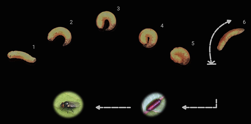 Secuencia de movimientos que despliega una larva de mosca lanceta (Neosilba spp.) antes de saltar, durante el salto, estadio de pupa y adulto. (1) Extensión, (2, 3) arqueo, (4 y 5) contacto entre extremos y uso de ganchos bucales para fijarse, (6) liberación de energía y salto. Imagen: Andrea Birke, tipografiada y modificada por Rebeca Escamilla.