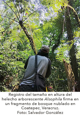 En el Laboratorio de Ecofisiología Vegetal del Instituto de Ecología, A.C. estudiamos a las poblaciones de helechos del bosque nublado porque enfrentan una amenaza inminente de desaparecer localmente debido a la fragmentación y al cambio en el uso de suelo en las pocas áreas naturales que quedan en la región y en el país. Los modelos demográficos matriciales desarrollados para los helechos del bosque nublado indican que las poblaciones pueden crecer favorablemente en los fragmentos conservados si se mantiene o incrementa la superficie que ocupan y si permanecen las condiciones climáticas de alta humedad y temperatura fresca.