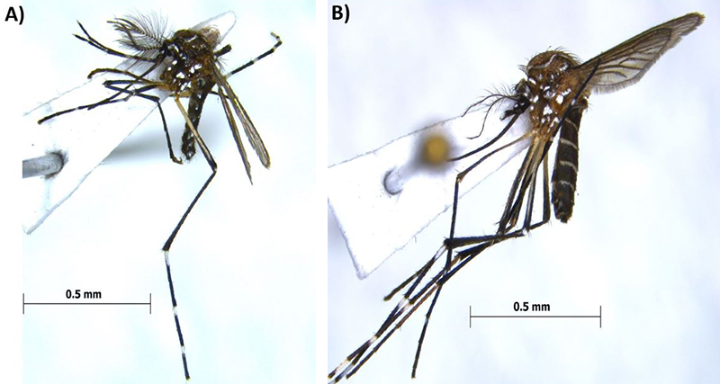 Figura 3. A) Macho y B) hembra del mosquito Aedes aegipty. Imagen: Luis Arturo Ibarra Juárez