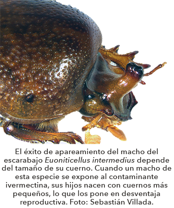 Las condiciones estresantes durante el desarrollo pueden deberse a la exposición de los individuos a contaminantes ambientales, y puede haber repercusiones sobre la siguiente generación, aunque esta generación no se exponga a la condición desfavorable. Por ejemplo, en el escarabajo del estiércol, Euoniticellus intermedius, un equipo de investigación del INECOL descubrió que machos que se han alimentado de estiércol que contiene ivermectina (un desparasitante potente que es frecuentemente utilizado en el ganado) producen hijos con cuernos más pequeños que machos que nunca han sido expuestos a esta droga. El cuerno de los escarabajos del estiércol es utilizado en peleas entre machos, cuando hay disputas por acceso a hembras, a alimentos, y/o a recursos para reproducción. Machos con cuernos más grandes generalmente tienen mayor probabilidad de ganar estas disputas, y por lo tanto de reproducirse. Por lo tanto, haber tenido un padre que estuvo expuesto a ivermectina puede reducir el éxito reproductivo de un macho – aunque este macho jamás se exponga directamente a ivermectina.