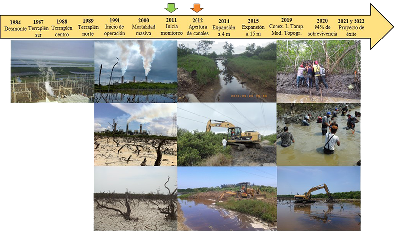 Fig 1. Cambios en el manglar de de Tampamachoco de 1984 a 1991 y acciones realizadas para su restauración tras identificar las causas de la mortalidad masiva. La flecha verde indica cuando se inició el programa de monitoreo y la flecha roja cuando iniciaron las actividades y acciones de restauración.