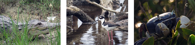 Fig 2. Distintas especies animales que habitan el ecosistema de manglar, algunas de las cuales se encuentran dentro de alguna categoría de protección por su vulnerabilidad. (A) Crocodylus moreletti, cocodrilo(B) Himantopus mexicanus, monjita americana, (C) Cardisoma guanhumi cangrejo azul de tierra.