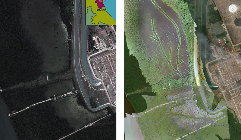 Fig 3. Por medio de las fotografías tomadas con el dron, podemos identificar zonas de interés en las que se pueden realizar acciones de restauración de acuerdo con su deterioro. La imagen de la izquierda es de 2009 tomada de Google Earth y la de la derecha es un ortomosaico compuesto de fotografías tomadas con el dron en 2022.