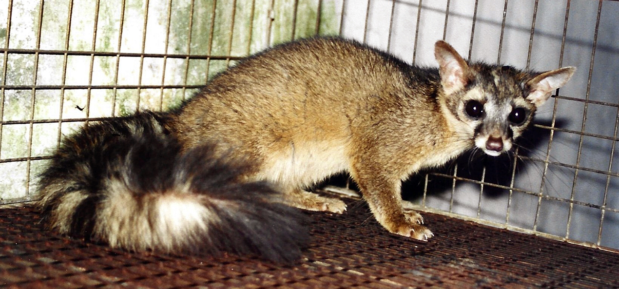 Cacomixtle tropical (Bassariscus sumichrasti) capturado en el bosque mesófilo de montaña en Xico, Veracruz y que se mantiene como mascota. Nótense las uñas largas y no retractiles a diferencia de su primo del norte (Foto: A. González-Romero).
