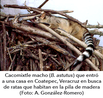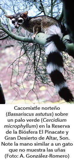Los cacomixtles son mamíferos que pertenecen a la familia Procyonidae que está representada por 6 géneros y 14 especies que, aunque emparentadas son físicamente diferentes. Esta familia de mamíferos americanos se distribuye en los ambientes templados y tropicales de Norte américa y Sudamérica, incluye a los mamíferos conocidos como mapaches, tejones, martuchas y cacomixtles. En México se encuentran 4 géneros: Bassariscus (cacomixtles), Nasua (tejones, coatís o pizotes), Potos (martuchas) y Procyon (mapaches) y 6 especies. De estas especies son los cacomixtles los menos conocidos por la gente ya que por sus hábitos secretos y actividad nocturna pasan desapercibidos para la mayoría de la gente incluso en zonas en donde son abundantes, Tenemos dos especies una conocida como cacomixtle norteño (Bassariscus astutus) y el tropical (B. sumichrasti), el primero prefiere los bosques templados y zonas áridas, y está muy asociado a los roqueríos y es de hábitos escansoriales (se desplaza tanto en tierra como en árboles) y el segundo es habitante de los bosques tropicales y de hábitos netamente arborícolas.