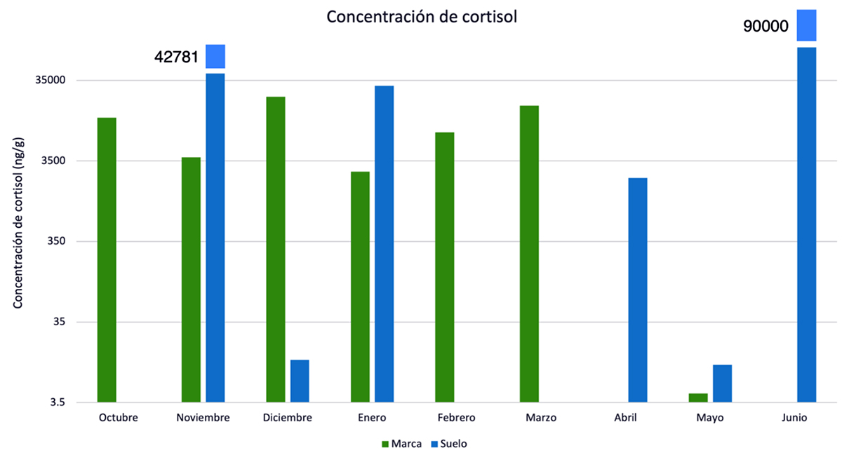 Del total de 54 muestras, 34 fueron excretas de Marca y 20 se ubicaron sobre el Suelo. Las concentraciones de cortisol fueron más altas en las excretas que se encontraron sobre el suelo como se aprecia en la Figura 3 sugiriendo que cada tipo de muestra tiene una función distinta en las actividades de los zorros.