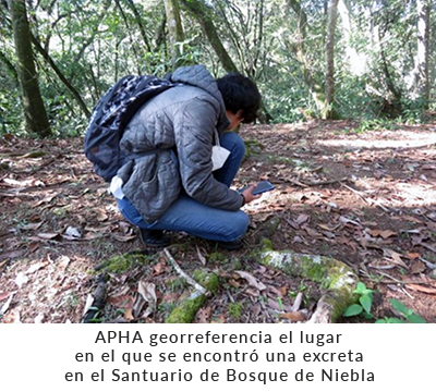 Entre octubre de 2022 y junio de 2023 se visitó el Santuario de Bosque de Niebla en el municipio de Xalapa del estado de Veracruz, durante 3 días consecutivos cada mes. Se recorrió el camino trazado en busca de excretas frescas para que la descomposición no cambiara las concentraciones de cortisol. Las excretas colectadas se guardaron en bolsas de plástico rotuladas con la fecha, especificando si estaban sobre el Suelo o sobre superficies altas (Marca). El lugar en el que se localizaba cada muestra se registró con un GPS (Figura 2).