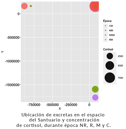 Ubicando las muestras encontradas como Marca y las encontradas sobre el Suelo dentro del espacio del Santuario, se observa que en la época NR y R los zorros recorren un área más amplia dentro del Santuario (Figura 4). En cambio, en la época en que los cachorros empiezan sus exploraciones del lugar (C) las excretas se ubican en zonas aledañas a la madriguera, como resultado del cuidado parental por los zorros adultos.