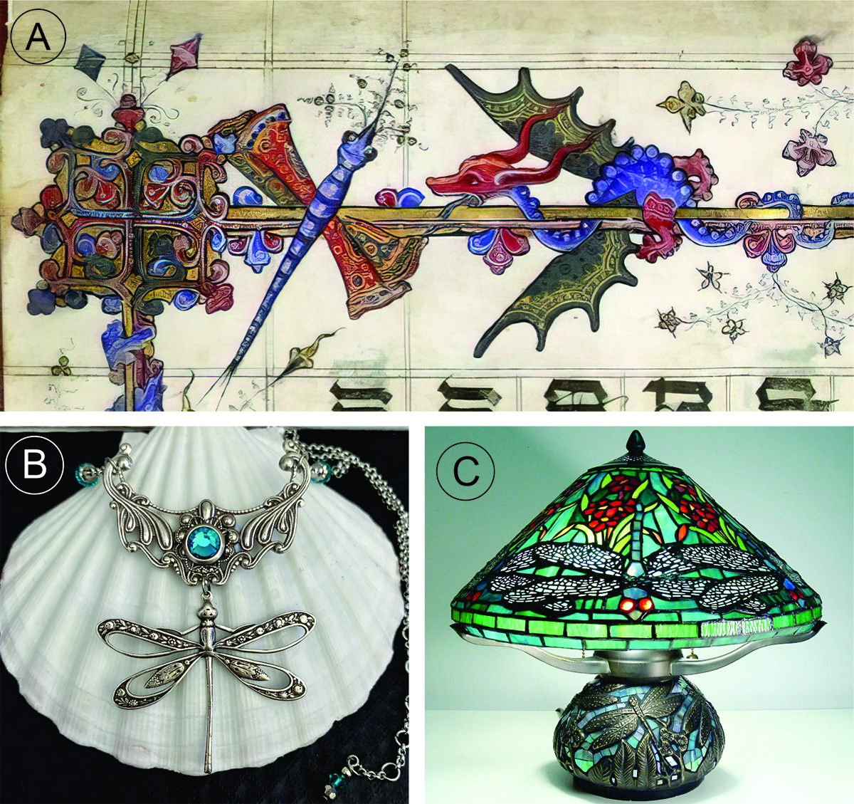 A. Dragonfly y dragón en Manuscrito medieval iluminado, Lovell Lectionary, Biblioteca Británica – Ilustración detallada que combina la libélula y el dragón en un contraste entre lo real y lo mítico, típico del arte medieval (tomada de: https://n9.cl/ojag5). B. Collar de plata con libélula – Joya refinada donde la libélula simboliza transformación y equilibrio en el diseño artístico (tomada de: https://n9.cl/ytvoi). C. La Fine Art Tiffany Dragonfly Table Lamp es una lámpara de mesa inspirada en el estilo Tiffany, caracterizada por su pantalla de vidrio teñido con un diseño de libélulas. Este tipo de lámpara es una reproducción del trabajo de Louis Comfort Tiffany, famoso por sus creaciones en vidrio artístico (tomada de: https://n9.cl/bayjo).