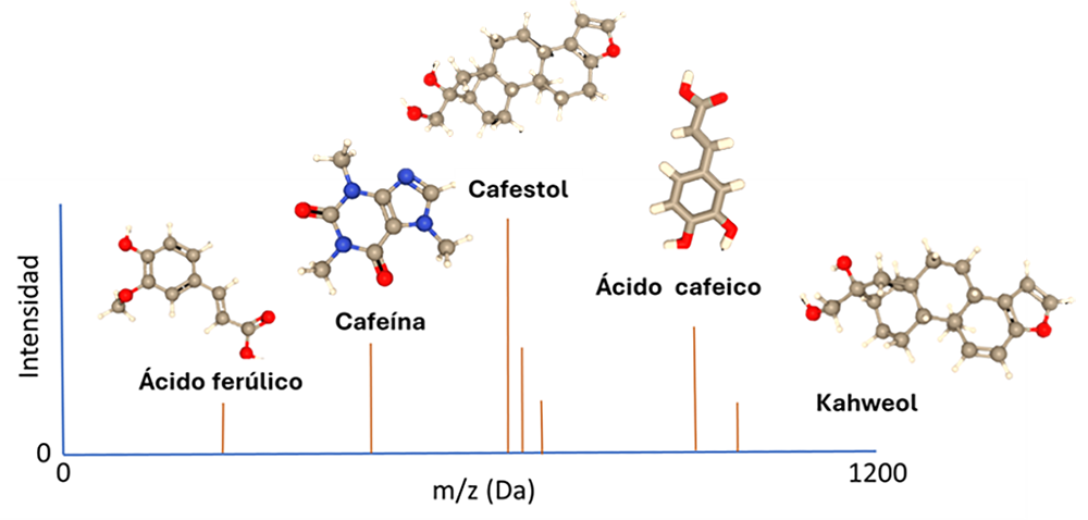 Para descubrir los secretos químicos de la defensa en las plantas de café, los científicos utilizan una técnica químico-analítica llamada espectrometría de masas (EM), y herramientas estadísticas que les permiten realizar los análisis metabolómicos comparativos. La EM permite identificar y cuantificar los metabolitos presentes en una muestra, como una hoja, una raíz, o un grano de café. Esta aproximación funciona de la siguiente manera: Primero, se convierte la muestra en una mezcla de moléculas en fase gaseosa. Luego, se aceleran estas moléculas a través de un campo magnético utilizando diferentes voltajes, separándolas según su peso (masa) y carga. Finalmente, se detecta y analiza la señal de cada molécula, creando un espectro de masas único (Figura 2) que es equivalente a una huella dactilar, en este caso espectrométrica.