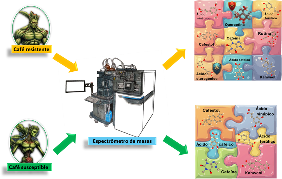 Este espectro de masas es como un rompecabezas químico. Cada pieza del rompecabezas representa un metabolito específico, y al ensamblarlas, obtenemos una imagen completa de la composición química de la planta. Al comparar los rompecabezas de distintas plantas de café, algunas resistentes y otras susceptibles, podemos identificar las piezas clave que faltan o sobran, y revelar así las diferencias detrás de su estado de salud o enfermedad, desarrollo y crecimiento, y descubrir patrones y conexiones entre los metabolitos. En la Figura 3 se muestra gráficamente este concepto. Te has puesto a pensar, ¿cuántos compuestos químicos están presentes en una planta? En realidad, hay muchos y con funciones muy distintas. Si comparas los rompecabezas químicos que provienen de las plantas resistentes y de las plantas susceptibles encontrarás compuestos químicos que están presentes en ambas plantas, como la cafeína y el ácido ferúlico. El hecho de que estén presentes en ambas plantas sugiere que estos compuestos no son responsables de que la planta resistente toleré mejor las condiciones de estrés abiótico o biótico. Por otro lado, las plantas más resistentes presentan compuestos químicos como la quercetina, el ácido clorogénico, entre otros que no están presentes en la planta susceptible y son precisamente estos metabolitos los probables responsables de la resistencia.