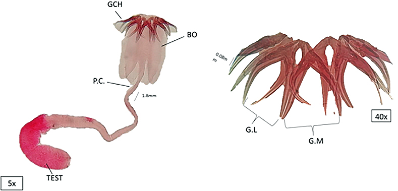 Acanthobothrium sp. 1. (1) Cuerpo. BO: botridio; GCH: ganchos; P. C.: pedúnculo cefálico; TEST: testículos. (2) Ganchos. G. L.: gancho lateral; G. M.: gancho medial.