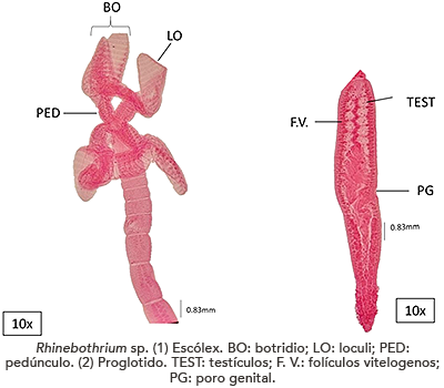 Uno de los elasmobranquios que resalta por su importancia económica y ecológica es la raya-látigo, Hypanus americanus (fig. 1), en la cual se han identificado 15 especies de endoparásitos (12 céstodos y 3 nemátodos) en las costas del estado de Veracruz (Pozos-Carré et al. 2020). Sus infracomunidades están compuestas principalmente por céstodos, siendo las especies Acanthobothrium sp.1 (fig. 2) y Rhinebothrium sp. (fig.3) las más dominantes, teniendo abundancias muy superiores al resto (fig. 4).