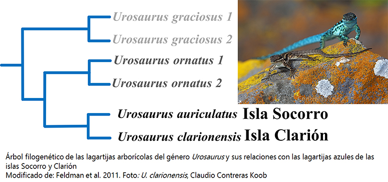 A través de los árboles genealógicos derivados del ADN mitocondrial se han identificado las relaciones entre especies hermanas o cercanamente emparentadas. Entre los ejemplos que nos brindan las islas mexicanas, tenemos que, con 2800 pares de bases de ADNmt se pudo confirmar que la culebra nocturna de isla Clarión (Archipiélago de Revillagigedo) es una especie distinta a las continentales y que está estrechamente relacionada con la culebra nocturna de isla Santa Catalina en el Golfo de México, y con las culebras nocturnas de Sonora y Sinaloa. Estas relaciones no sólo evidencian el parentesco entre las culebras nocturnas de cada región sino también su origen y la posible ruta de colonización desde el continente al archipiélago de Revillagigedo. Una historia similar se revela para las lagartijas azules del mismo archipiélago, con aproximadamente 3400 pares de bases de ADNmt. Las lagartijas de Isla Clarión e Isla Socorro tienen un parentesco muy estrecho entre sí, y con las lagartijas arborícolas del continente de la misma región de Sonora-Sinaloa. Estas relaciones indican una dispersión del continente hacia las islas seguido de la separación de las especies. Este caso también se ha confirmado a través del genoma nuclear.