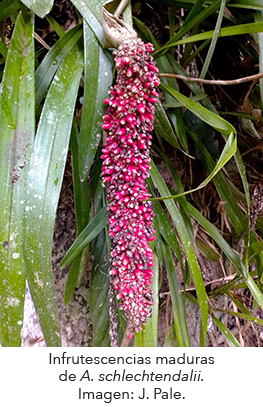 Esta especie es originaria de Belice, Guatemala, Honduras, México (Campeche, Chiapas, Guerrero, Jalisco, Nayarit, México, Oaxaca, Quintana Roo, Tabasco, Veracruz y Yucatán) hasta Nicaragua. En México se le encuentra de 0-1500 (-1700) m, pero más común por debajo de los 1000 m y en los siguientes tipos de vegetación: selva alta perennifolia, selva mediana subperennifolia, selva mediana subcaducifolia, selva baja caducifolia, bosque caducifolio, encinar, palmar, popal, vegetación de dunas costeras, en vegetación riparia, acahuales y cafetales. La planta es útil para la fauna creando hábitat para insectos de hojarasca, debido a la forma de sus raíces y hojas (intencionada en colectar sustrato) (Figura 3). Los principales polinizadores de A. schlechtendalii son coleópteros de las familias Curculionidae, Phalacridae, Chrysomelidae, Bruchidae y Anthicidae, se alimentan de las gotas estigmáticas y del polen. Se tiene documentado que zorros grises (Urocyon cinereoargenteus) se alimentan de los frutos maduros. Ortópteros, lepidópteros (larvas) y alimentadores de savia (Homóptera y Hemíptera) pueden alimentarse de las hojas o la savia (Hellmuth N. & S. D’Angelo, 2022). Mientras para el ser humano aparte de su uso ornamental, se ha identificado como medicinal, ya que se le atribuyen propiedades curativas. De hecho, se cree que tuvo un importante significado para las culturas prehispánicas. Las hojas han sido utilizadas desde tiempos remotos en la medicina tradicional con múltiples propósitos, principalmente para afecciones inflamatorias graves y crónicas, como analgésico y antiedematoso para calambres, dolores musculares, reumatismos, artritis y parálisis. También se le reconoce en la atención de padecimientos renales y con propiedades referidas a una capacidad nefroprotectora (protección de la función renal y prevenir la progresión de la enfermedad crónica), utilizando la infusión de la raíz como agua de tiempo (Zavala-Ocampo et al., 2013). También, evidencias científicas señalan la presencia de antioxidantes y compuestos de tipo fenólicos como responsables del potencial antiinflamatorio de los extractos orgánicos de raíz y hojas de A. schelechtendalii (Stark et al., 2009). Mas interesante es que las hojas y las raíces mostraron una fuerte actividad anticancerígena y las raíces liofilizadas (no secadas al aire) también mostraron fuertes propiedades de inhibición del crecimiento y de inducción de la apoptosis en la leucemia y el cáncer de mama (Abu, et al., 2022).